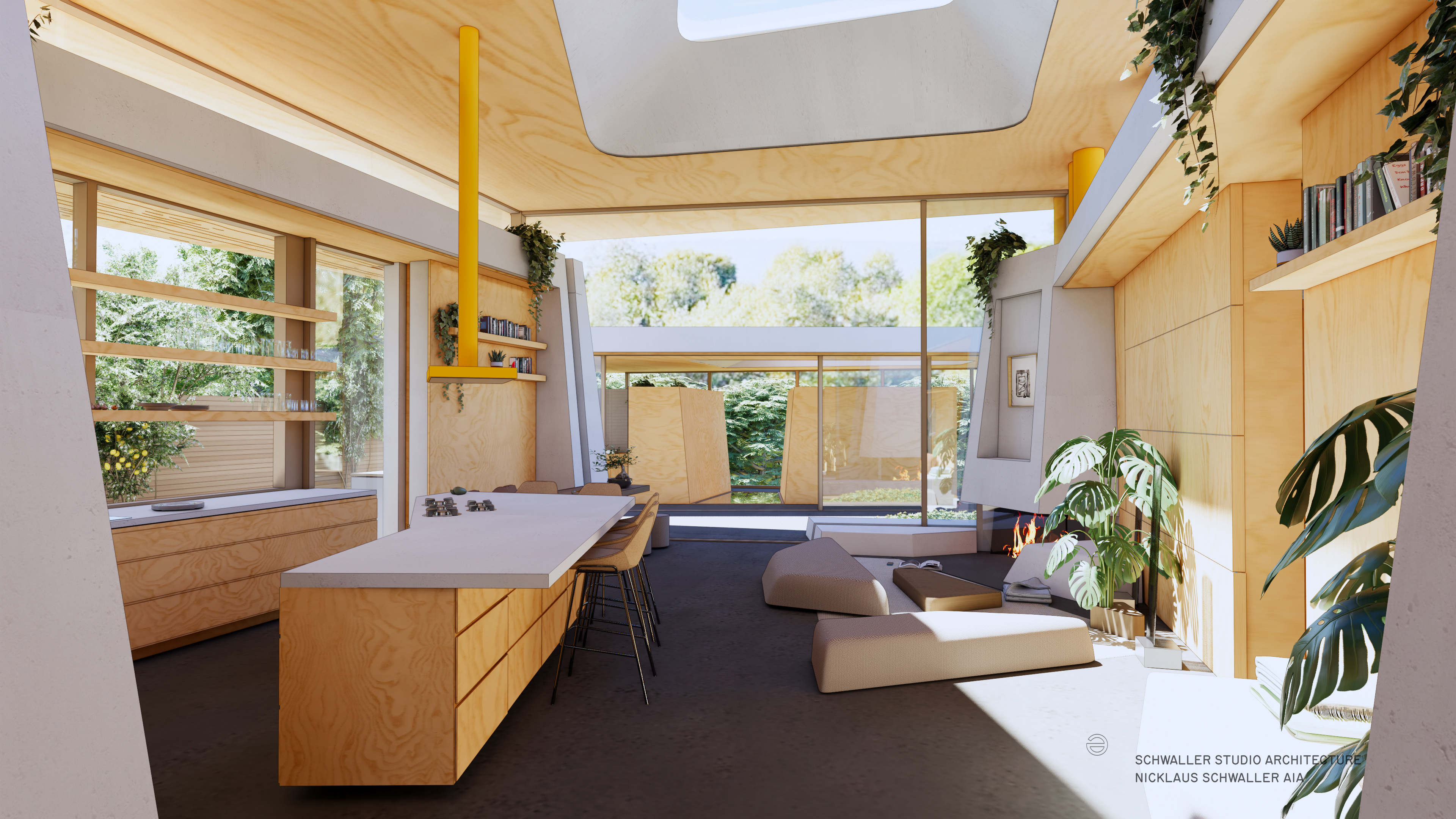 The fire-resitant concrete shell is inhabited with interior volumes of Douglas Fir plywood.
