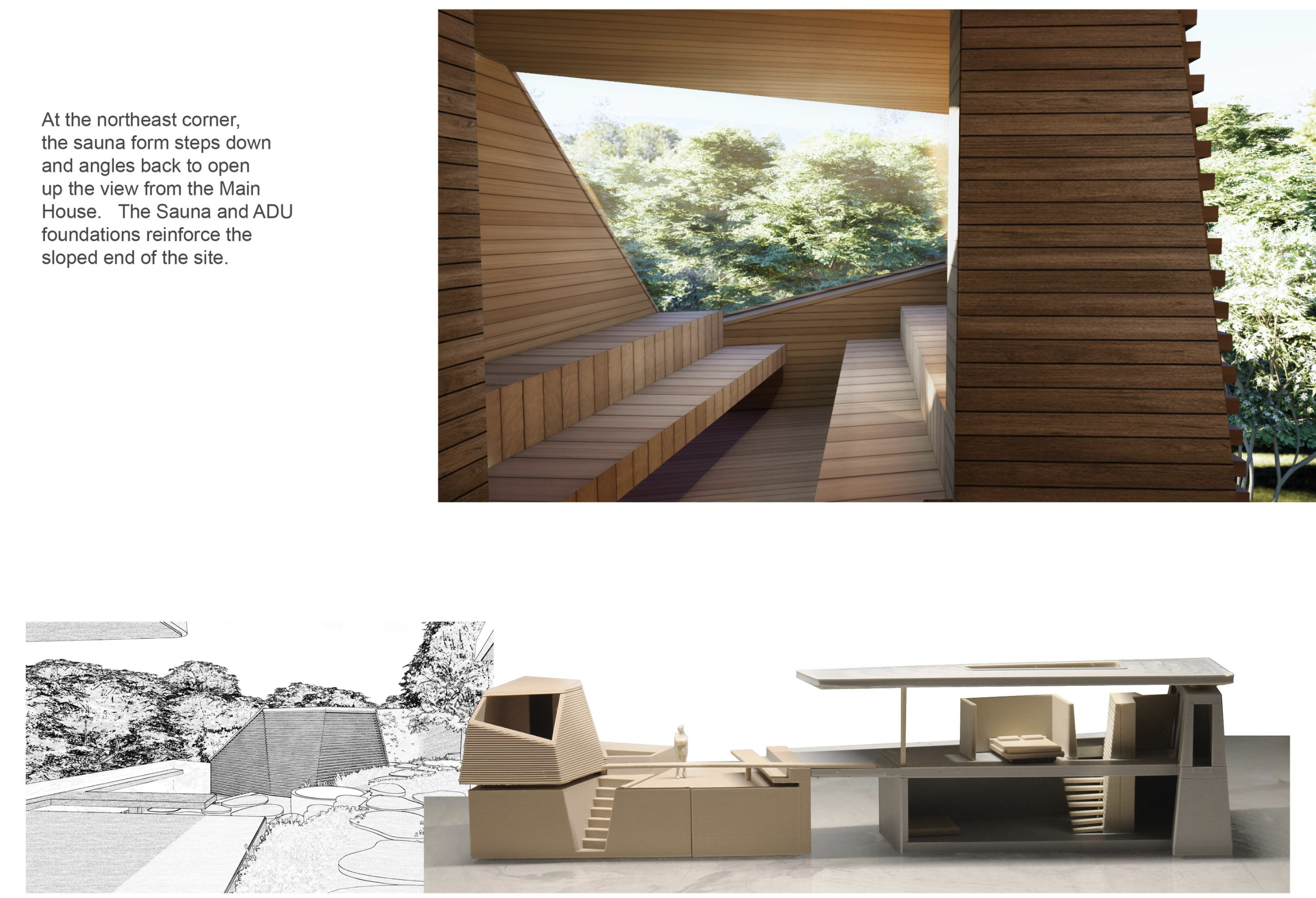 The guest house and sauna anchor the corners of the backyard while defining the outdoor room,